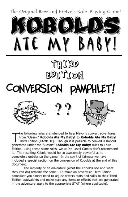 Kobolds Ate My Baby. Kobolds Ate My Baby. This edition is based off of the third edition rules with a smattering of earlier and later editions of the game. Account Lists. In KOBOLDS ATE MY BABY. Criado por Chris ONeill Dan Landis publicados pela 9th Level Games em 2005 na sua versão Deluxx. If you dont he will eat youafter all the meat of.